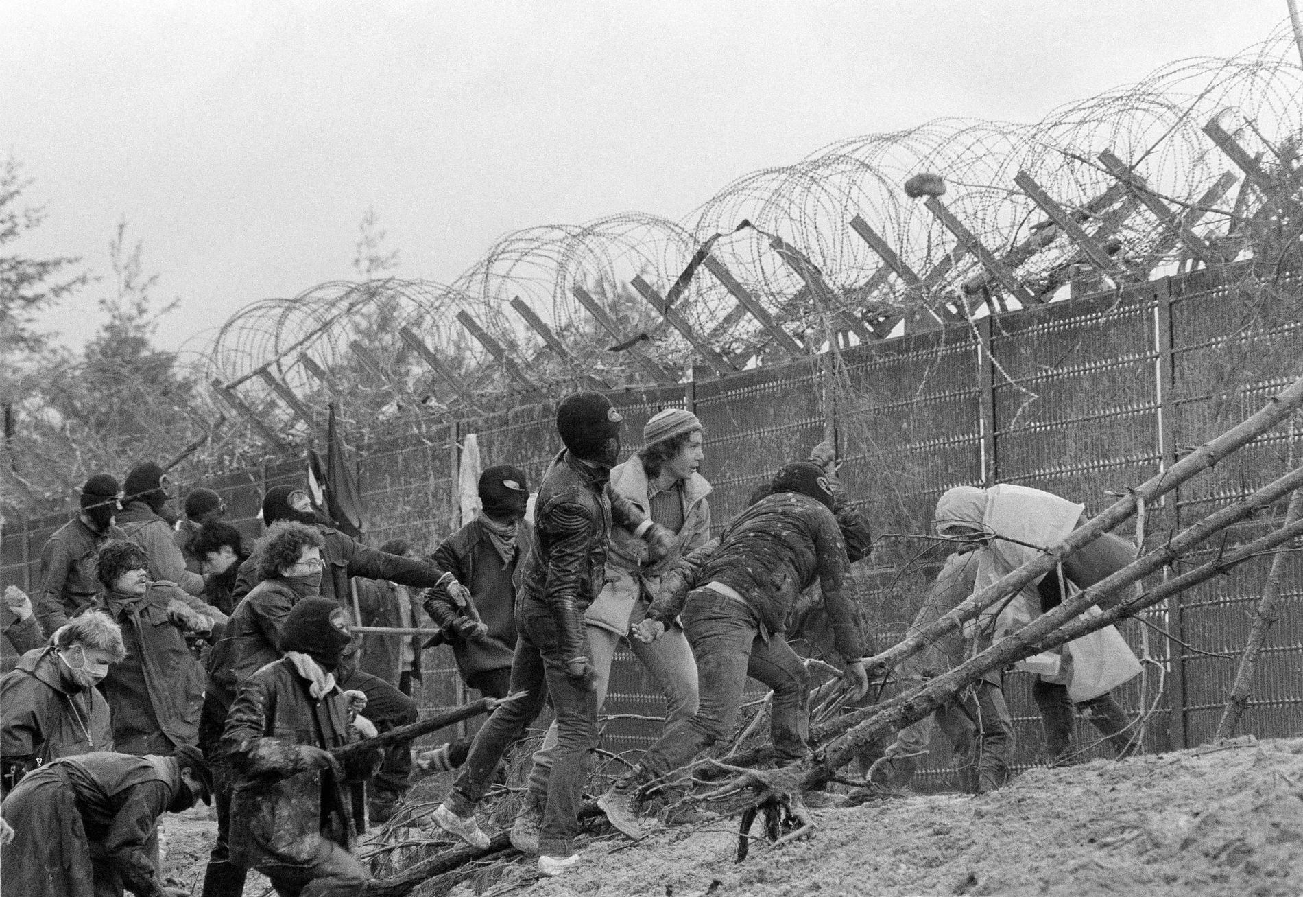 Manifestantes escalando a cerca de um canteiro de obras de uma usina de reprocessamento nuclear em Wackersdorf, em 1986. Fotografia: Dieter Endlicher/AP