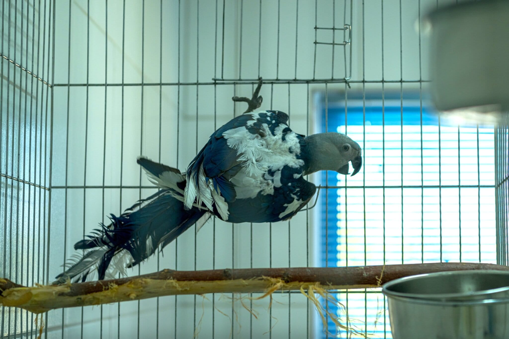 Filhote de arara-azul-de-lear com circovírus, apresentando descoloração branca nas penas, em isolamento no centro de reprodução de Curaçá. Foto de Miguel Monteiro.