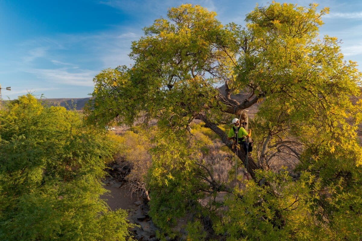 Assistentes comunitários locais sobem em árvores com ninhos de araras-azuis, outra espécie de papagaio, para coletar amostras e avaliar a contaminação por circovírus. Imagem de Miguel Monteiro.