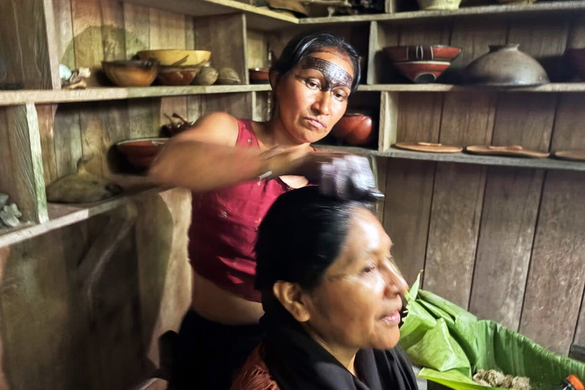 Em seu rosto, desenhos intrincados pintados com a mesma tinta wituk criam padrões geométricos ousados que permanecerão por uma semana — uma tela que revela sua identidade como guardiã desta comunidade remota. Sentada à mesa de madeira em sua cabana tradicional, Gayas fala sobre os três valores fundamentais de Pakayaku que norteiam todos os aspectos de suas vidas: humildade, lealdade e dignidade.