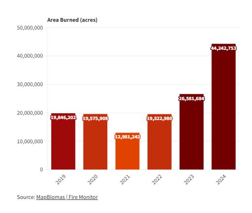 Segundo o Monitor de Incêndios da MapBiomas, a área queimada na Amazônia brasileira em 2024 aumentou em pelo menos 66% em comparação com o ano anterior , atingindo um pico em setembro, quando 13,7 milhões de acres foram consumidos pelas chamas, uma área aproximadamente do tamanho da Costa Rica. O número de focos de incêndio também aumentou 42,3% em relação a 2023. Dados do INPE, Instituto Nacional de Pesquisas Espaciais do Brasil, registraram 140.346 focos de incêndio em 2024, contra 98.639 no ano anterior, embora ainda abaixo do recorde histórico de 218.637, estabelecido em 2004.